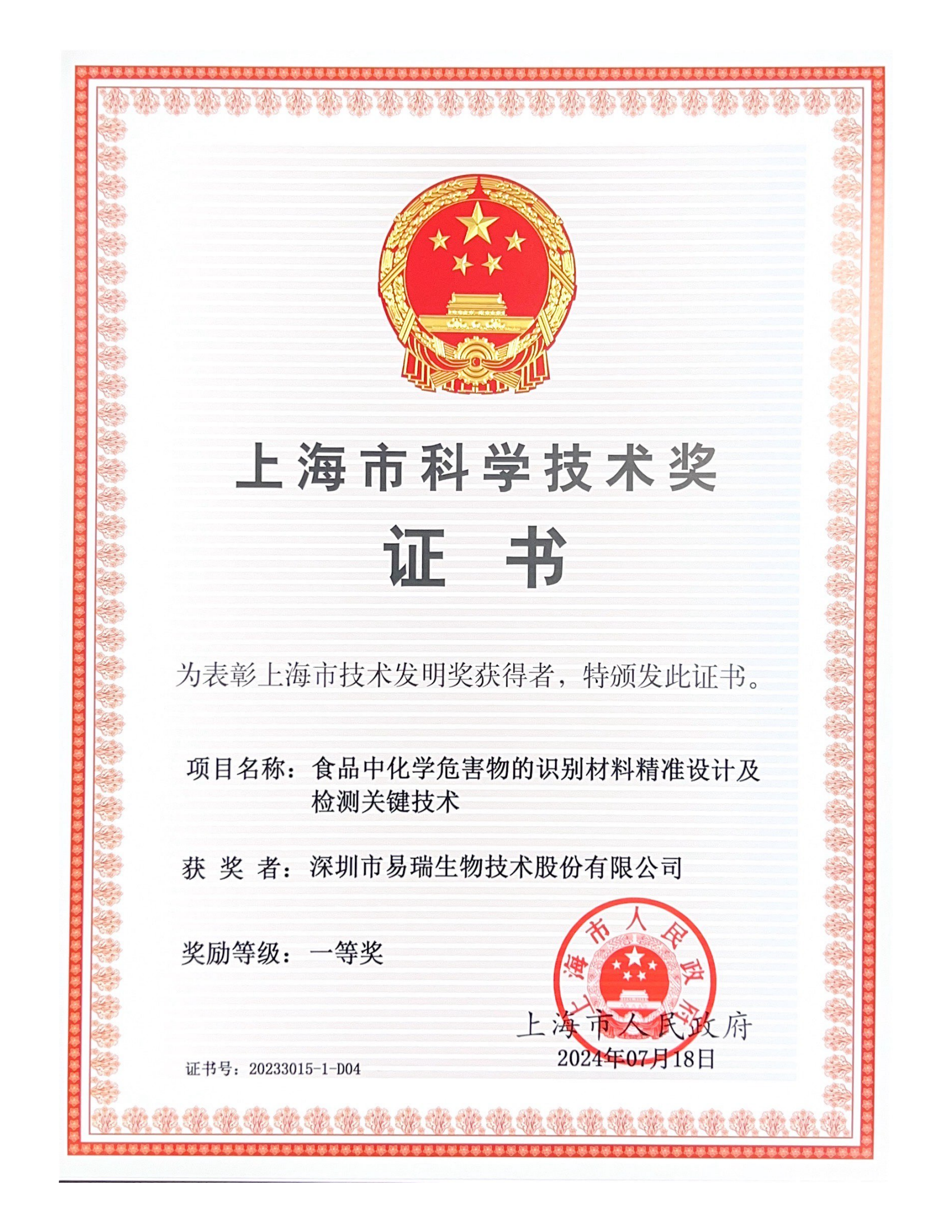 克日,,,,,,2023年度上海市科学手艺奖获奖名单正式宣布,,,,,,作为食物清静领域A股唯一上市公司,,,,,,威廉体育生物加入完成的“食物中化学危害物的识别质料精准设计及检测要害手艺”项目荣获2023年度上海市科学手艺发明奖一等奖。。。。。。威廉体育生物在科技类手艺奖项方面已累计斩获 19 项殊荣。。。。。。